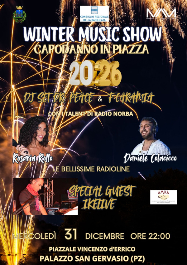 Mercoledì 31 Dicembre 2025 dalle ore 22:00 in piazza Vincenzo d’Errico a Palazzo San Gervasio è in programma il Capodanno in piazza.