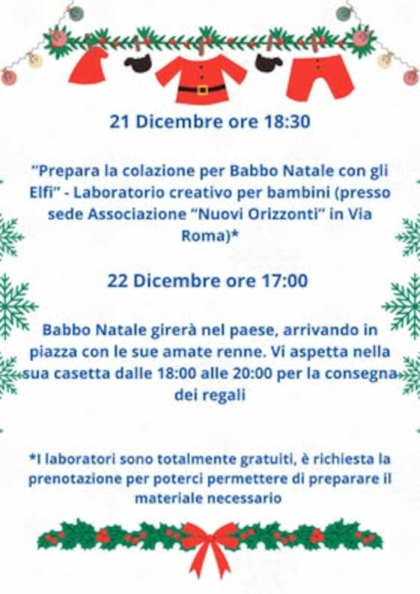 “Prepara la colazione per Babbo Natale con gli Elfi” – Laboratorio creativo per bambini (presso sede Associazione “Nuovi Orizzonti” in Via Roma)*