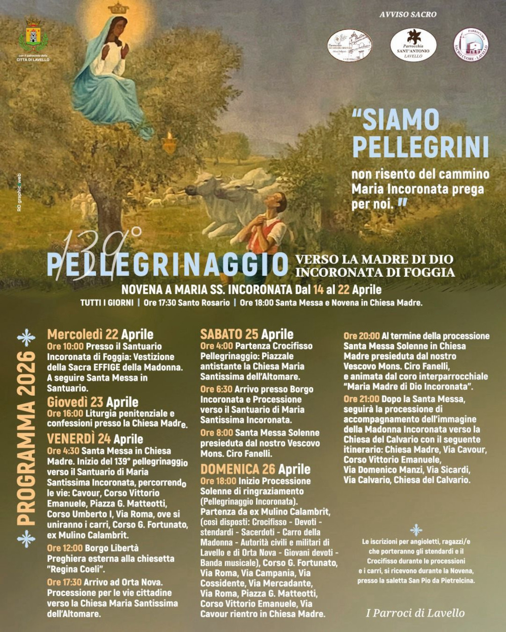 Il Pellegrinaggio che i lavellesi, da circa 130 anni, compiono per raggiungere la Santissima Incoronata di Foggia, rappresenta un evento davvero molto atteso e importante per l’intera comunità.