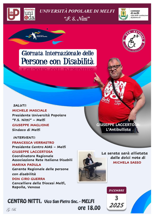 L’appuntamento è fissato per mercoledì 3 dicembre 2025 alle ore 18:00, presso il Centro Nitti di Vico San Pietro snc, a Melfi, per un incontro pubblico dedicato ai diritti, all’inclusione e alla valorizzazione delle persone con disabilità.