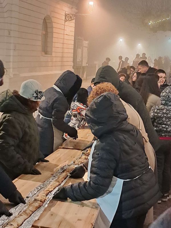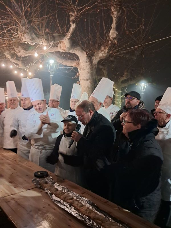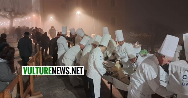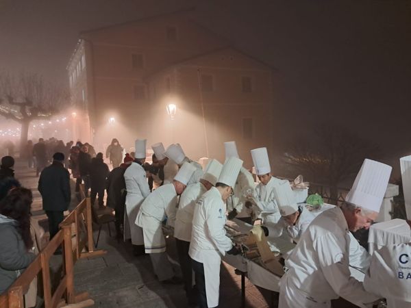 Oltre 20 chef al lavoro per due ore e mezzo insieme ad una comunità intera che ha aiutato nel tirare la sfoglia, in piazza della Vittoria, nonostante le rigide temperature.