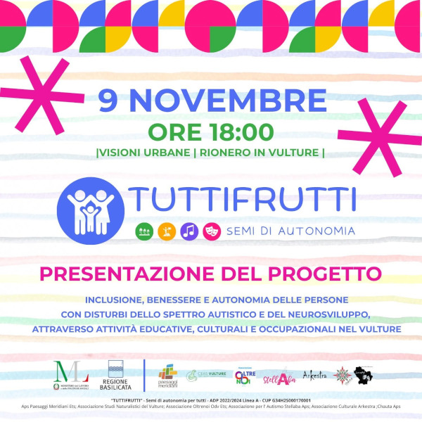 “Tuttifrutti – Semi di autonomia per tutti”, promosso da APS Paesaggi Meridiani ETS, con il partenariato di associazioni del Vulture, è rivolto alle persone con disturbo dello spettro autistico e del neurosviluppo.
