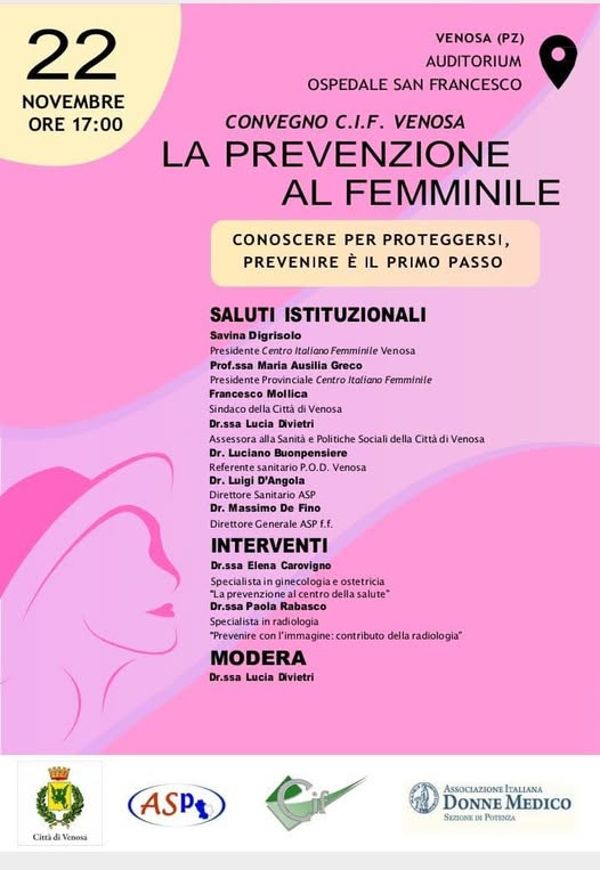 L’evento è promosso dal Centro Italiano Femminile, in collaborazione con ASP Basilicata, Città di Venosa e Associazione Italiana Donne Medico – Sezione di Potenza.