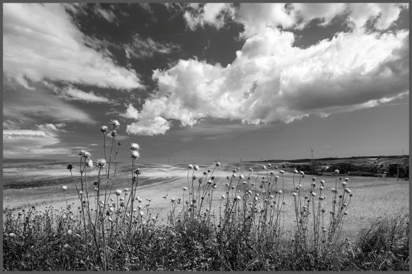 Attraverso 38 scatti in bianco e nero, il percorso si articola in quattro nuclei tematici e si snoda tra antichi basoli, colline e campi, masserie ed edifici ottocenteschi fino alle torri eoliche contemporanee, restituendo l’immagine di un territorio insieme antico e attuale, da sempre crocevia di genti e culture.