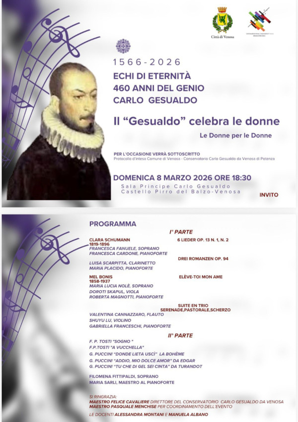 Il Comune di Venosa, in collaborazione con il Conservatorio “Carlo Gesualdo da Venosa” di Potenza, è lieto di annunciare un evento di altissimo valore culturale e simbolico che unisce musica, storia e visione futura.