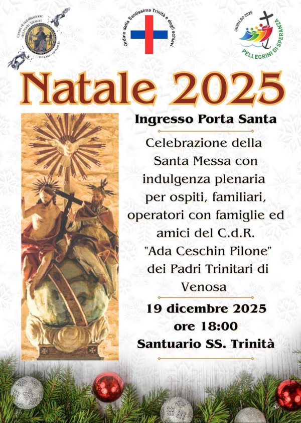 Alle ore 18:00, presso il Santuario della SS. Trinità, ingresso della Porta Santa e Celebrazione della Santa Messa con indulgenza plenaria
