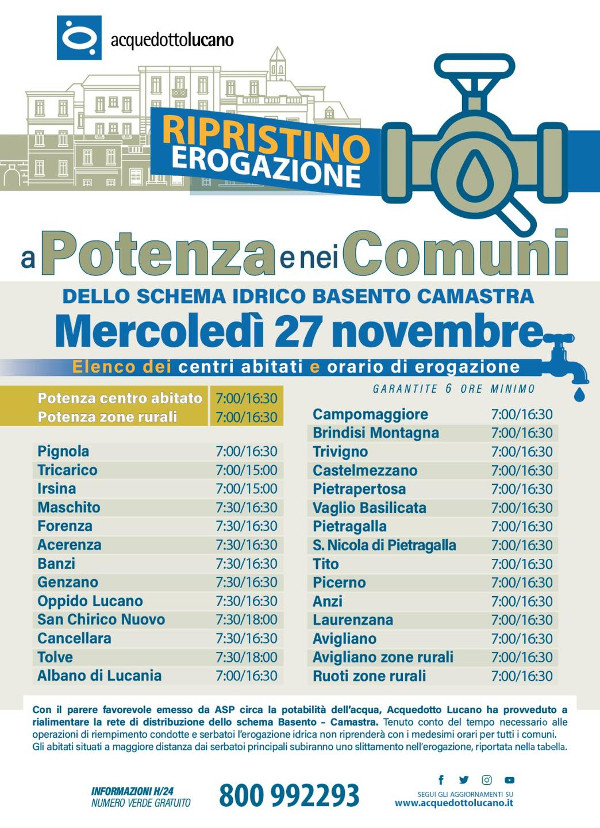 L’impegno che Acquedotto Lucano sta profondendo – con l’impiego di tutti i mezzi e di tutte le risorse disponibili – è quello di riuscire a portare a regime le erogazioni nei tempi più brevi possibili su tutto il territorio interessato, affinché possano esserci orari certi e precisi e possano essere ridotti il più possibile i disagi”.