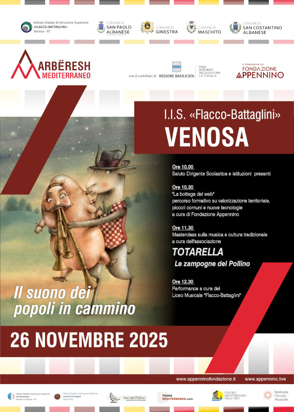Prossimo appuntamento in programma è per mercoledì 26 novembre 2025 a Venosa, all’Istituto di Istruzione Superiore “Flacco-Battaglini”, dove protagonista sarà la musica e la tradizione culturale.