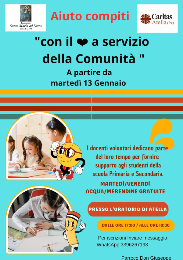 Il servizio nasce da Vito Amato volontario Caritas parrocchiale di Atella, con l’obiettivo di offrire un concreto sostegno educativo ai bambini e ai ragazzi del territorio, aiutandoli nello svolgimento dei compiti scolastici e favorendo la crescita personale e sociale.