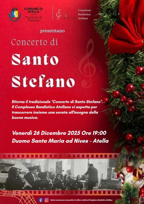 Venrdì 26 Dicembre, festa dedicata a Santo Stefano, la città di Atella proporrà il consueto concerto nel suggestivo Duomo della città.