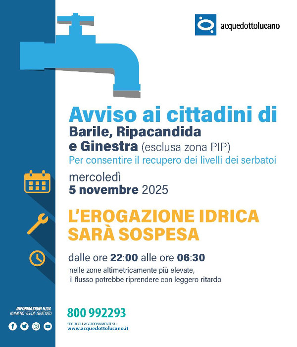 “Dal 20 ottobre scorso negli schemi idrici interregionali le forniture di acqua alla Basilicata sono state ridotte di 60 litri al secondo.