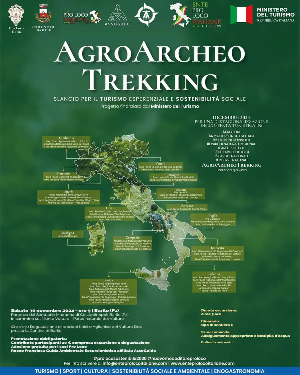 AgroArcheoTrekking per un turismo esperienziale e sostenibile coinvolge 14 Regioni, 56 comuni, 56 percorsi in tutta Italia, 6 parchi naturali nazionali, 18 parchi naturali regionali, 6 aree protette, 9 riserve naturali, 13 siti archeologici con il protagonismo attivo dei volontari delle Pro Loco ed enti del terzo settore affiliati all’Ente Pro Loco Italiane per promuovere: turismo, enogastronomia, sport, cultura, sostenibilità ambientale e sociale.