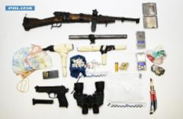 La perquisizione dell’abitazione ha permesso di sequestrare 90,87 grammi di cocaina, 78,51 grammi di hashish, un fucile realizzato artigianalmente privo di matricola, una carabina priva di matricola, 5 cartucce per fucile calibro 12, una pistola scacciacani priva di tappo rosso completa di caricatore contenente n. 6 cartucce, 11 cartucce sfuse calibro 9, la somma di 805,00 euro, oltre a materiale per il frazionamento e il confezionamento della droga.