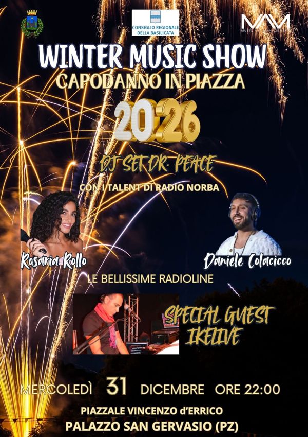 Mercoledì 31 Dicembre 2025 dalle ore 22:00 in piazza Vincenzo d’Errico a Palazzo San Gervasio è in programma il Capodanno in piazza.