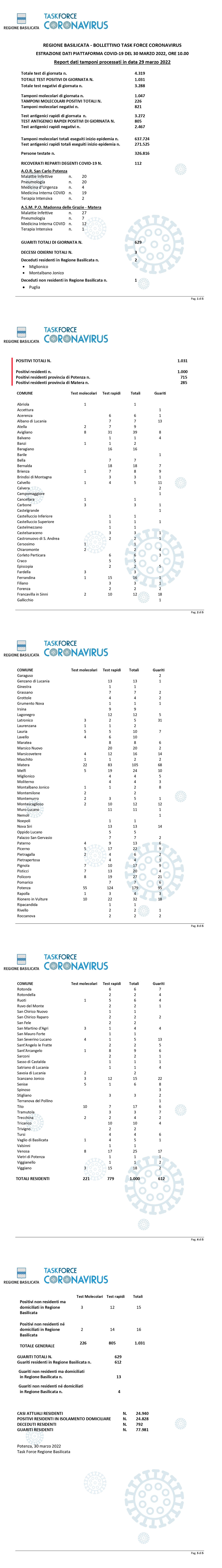 Sempre nella giornata di ieri, sono stati processati 4.319 tamponi (molecolari ed antigenici) per la ricerca di contagio da Covid-19, di cui 1.031 sono risultati positivi.
