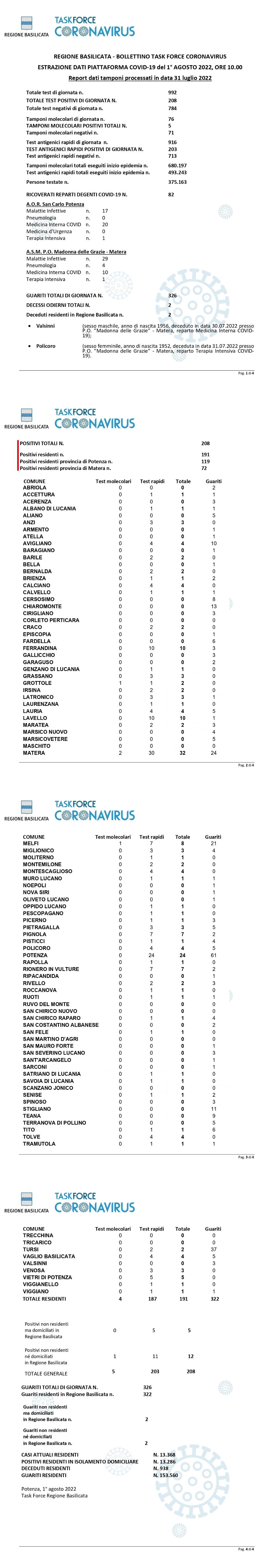 La task force regionale comunica che nella giornata di ieri 31 Luglio, sono stati processati 992 tamponi (molecolari ed antigenici) per la ricerca di contagio da Covid-19, di cui 208 sono risultati positivi.