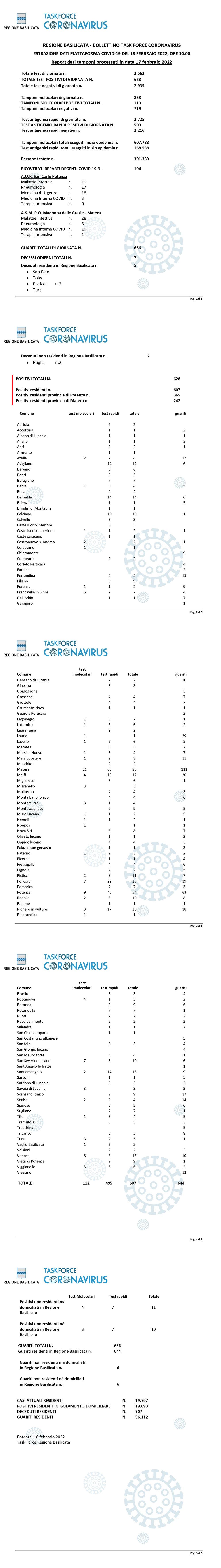 La task force regionale comunica che nella giornata di ieri, 17 febbraio, sono stati processati 3.563 tamponi (molecolari ed antigenici) per la ricerca di contagio da Covid-19, di cui 628 sono risultati positivi.