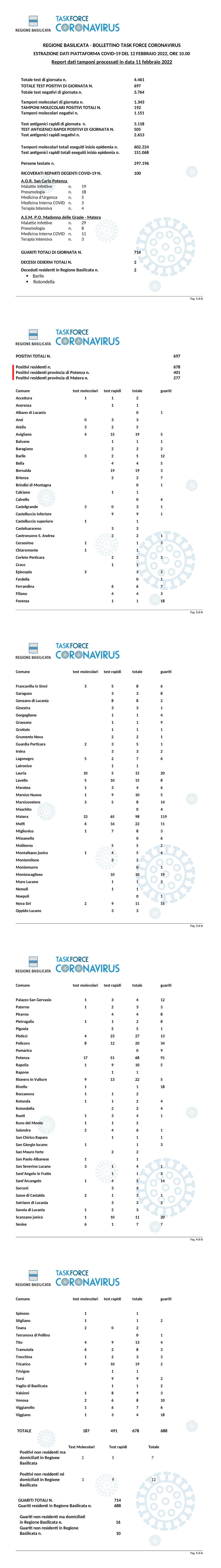 La task force regionale comunica che nella giornata di ieri, 11 febbraio, sono stati processati 4.461 tamponi (molecolari ed antigenici) per la ricerca di contagio da Covid-19, di cui 697 sono risultati positivi.