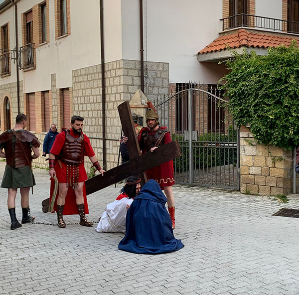 - il processo davanti a Pilato e la condanna di Cristo che sotto il peso della croce – realizzata con legno volutamente pesante – percorre con sacrificio e dolore le principali vie del paese.