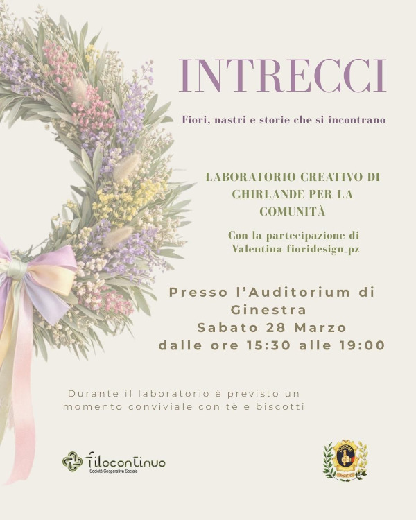 “Dalle 15:30 alle 19:00 realizzeremo insieme ghirlande di fiori e nastri, guidati dalla creatività di Valentina.