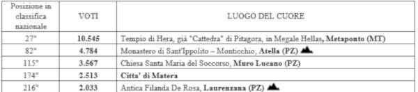 Tra i primi classificati, anche cinque luoghi in BASILICATA: