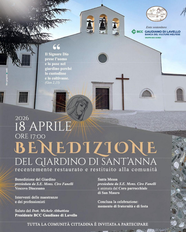 Sarà un momento di forte valore religioso, storico e comunitario quello in programma sabato 18 aprile alle ore 17:00 presso l’antica chiesetta di Sant’Anna a Lavello, dove il Vescovo, S.E. Mons. Ciro Fanelli, celebrerà la Santa Messa e procederà alla benedizione del sagrato e del giardino antistante il luogo di culto, recentemente ristrutturati grazie al sostegno del Fondo di Beneficenza e Mutualità della BCC Gaudiano di Lavello – Banca del Vulture Melfese.