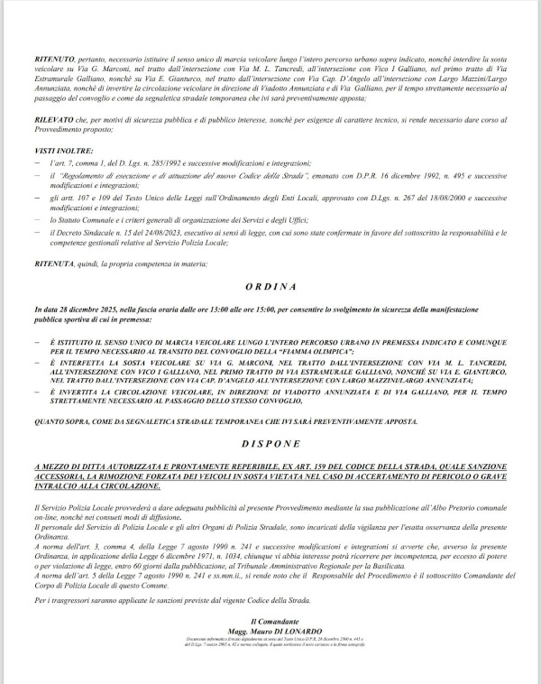 Nell’indicarvi l’ordinanza con le strade che saranno interessate dal passaggio, vi ringraziamo anticipatamente per la collaborazione”.