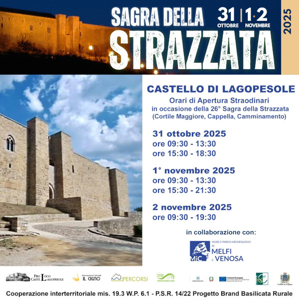 Per chi giunge a Castel Lagopesole nel primo fine settimana di novembre un’immersione nella storia con orari di apertura prolungati del Castello di Lagopesole in occasione della SAGRA DELLA STRAZZATA a Castel Lagopesole (PZ).