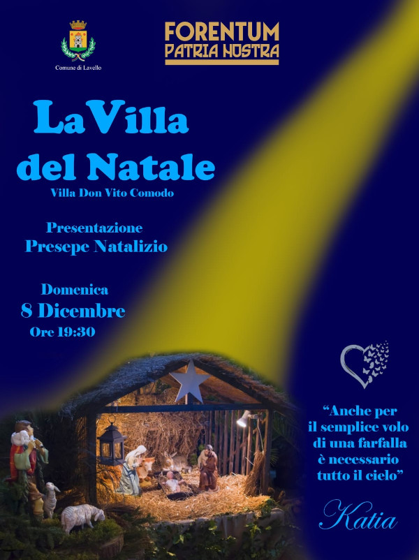 Anche quest’anno, come avviene dal Dicembre 2018, l’associazione Forentum Patria Nostra rinnova la magia delle festività natalizie a Lavello trasformando la villa Don Vito Comodo in un luogo di calore e speranza: La Villa del Natale.
