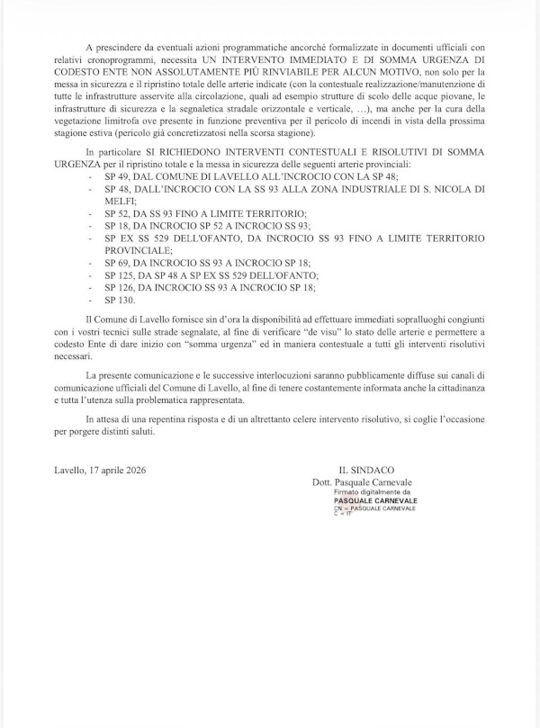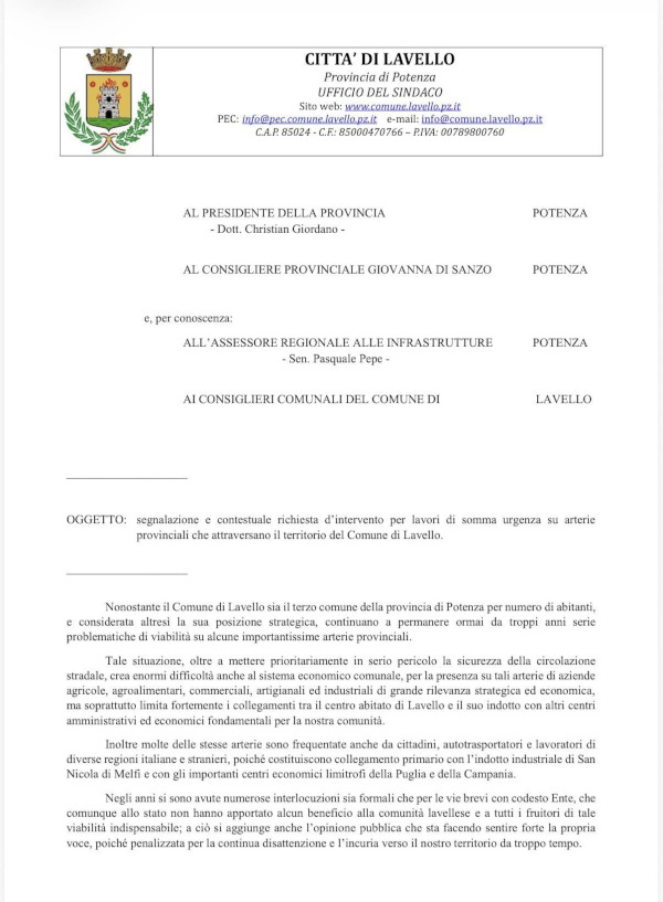 Il Comune di Lavello informa: