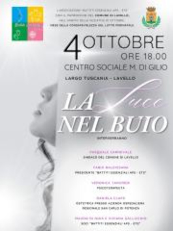 Domani, 4 ottobre alle ore 18, a Lavello, presso il centro sociale “M. Di Gilio”, si terrà un evento finalizzato alla sensibilizzazione su un tema molto delicato, quale il lutto perinatale, dal titolo “La luce nel buio”.