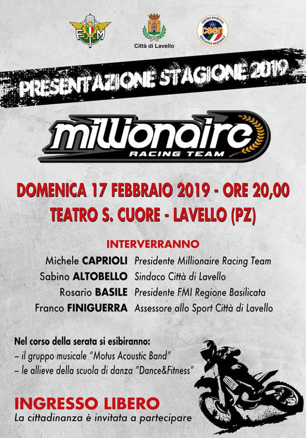 Il “Millionaire Racing Team” è il primo team lucano che debutterà e ci vedrà tutti protagonisti nel campionato italiano 2019 di motocross.