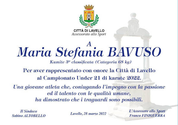 Dall’Amministrazione di Lavello giungono i complimenti a Maria Stefania Bavuso, terza classificata al campionato nazionale under 21 categoria 68 kg che si é tenuto al Palapellicone di Ostia: