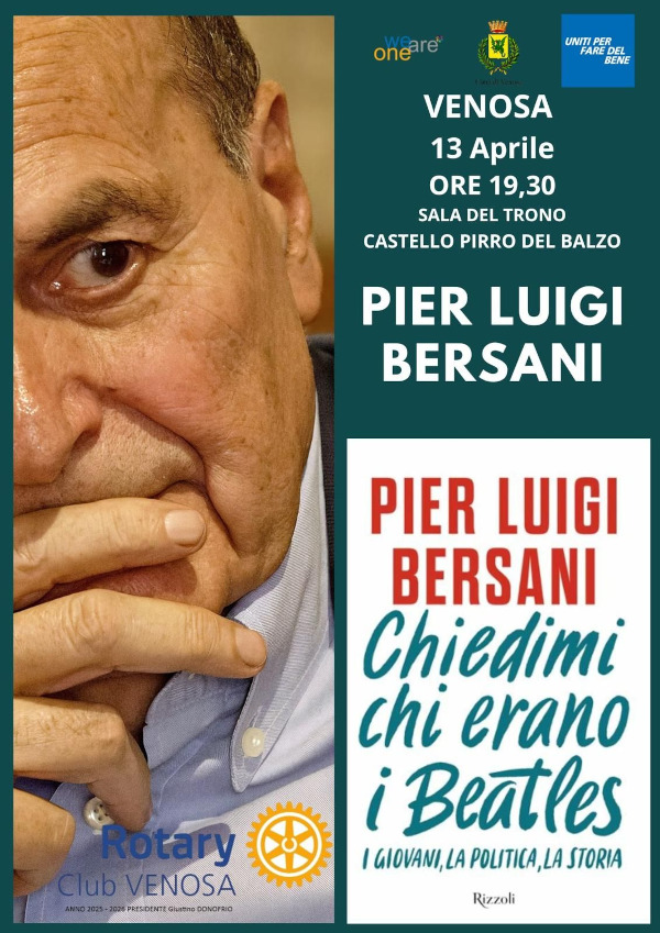 È con questo spirito che il Rotary Club Venosa è orgoglioso di ospitare, lunedì 13 aprile alle ore 19:30, presso la Sala del Trono del Castello Pirro del Balzo, Pier Luigi Bersani, protagonista della serata dedicata al suo libro “Chiedimi chi erano i Beatles”.