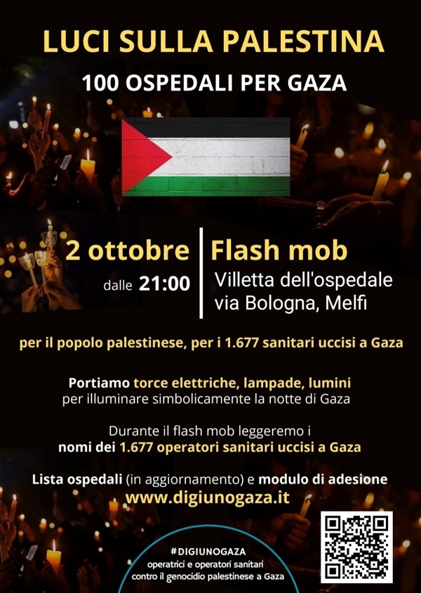 Alle 21:00, in contemporanea, in oltre duecento ospedali italiani, accenderemo insieme le nostre luci per illuminare simbolicamente la notte di Gaza e ricordare le oltre 60.000 vittime palestinesi degli ultimi due anni, tra cui i 1677 sanitari dei quali  saranno letti i nomi collettivamente durante il flash mob.