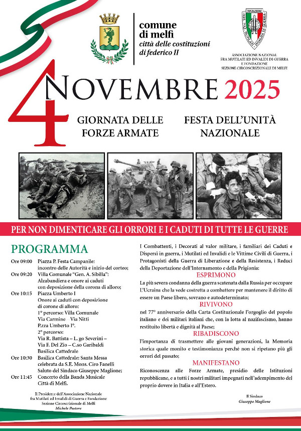 Il Comune di Melfi, in collaborazione con l’Associazione Nazionale fra Mutilati ed Invalidi di Guerra e la Fondazione Sezione Circoscrizionale di Melfi, organizza una solenne commemorazione in occasione della Giornata delle Forze Armate e della Festa dell’Unità Nazionale, il prossimo 4 novembre 2025.