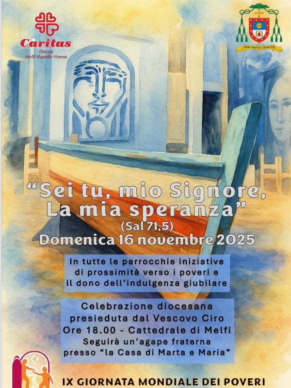 Domenica 16 novembre 2025 Melfi celebrerà la IX Giornata Mondiale dei Poveri, voluta da Papa Leone XIV, che ha scelto per quest’anno il tema: “Sei tu, mio Signore, la mia speranza” (Sal 71,5).