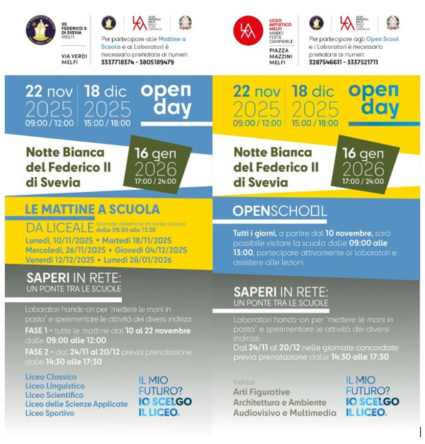 - Open School Artistico – dal 10 novembre al 26 gennaio Un invito a entrare nel cuore pulsante della creatività. Durante le giornate dedicate all’Open School Artistico, studentesse e studenti potranno vivere un’esperienza immersiva nel Liceo Artistico del “Federico II di Svevia”, partecipando attivamente ai laboratori o assistendo alle lezioni.