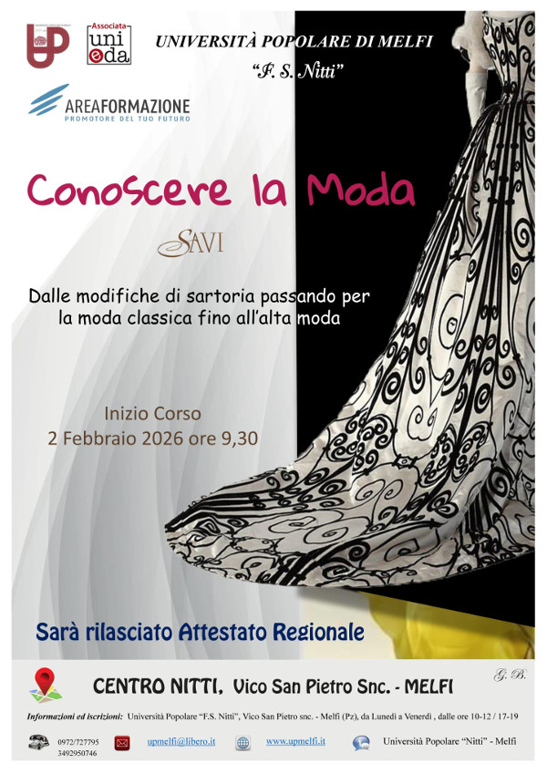 L’Università Popolare “F.S.Nitti” organizza, in collaborazione con Savi spose e Area formazione, un corso di “CONOSCERE LA MODA ”: Dalle modifiche di sartoria passando per la moda classica fino all’alta moda.
