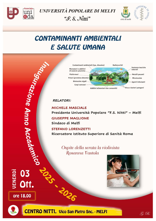 Per l’occasione, l’Unipop organizza l’incontro pubblico sul tema “Contaminanti ambientali e salute umana”, Appuntamento in agenda per venerdì 3 ottobre 2025, a partire dalle ore 18.00, presso la sede storica del Centro “F. S. Nitti” di Vico San Pietro a Melfi.