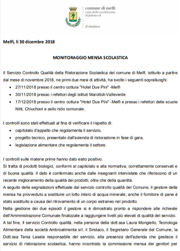 “Il Servizio Controllo Qualità della Ristorazione Scolastica del comune di Melfi, istituito a partire dal mese di Novembre 2018, nei primi due mesi di attività, ha svolto i seguenti sopralluoghi: