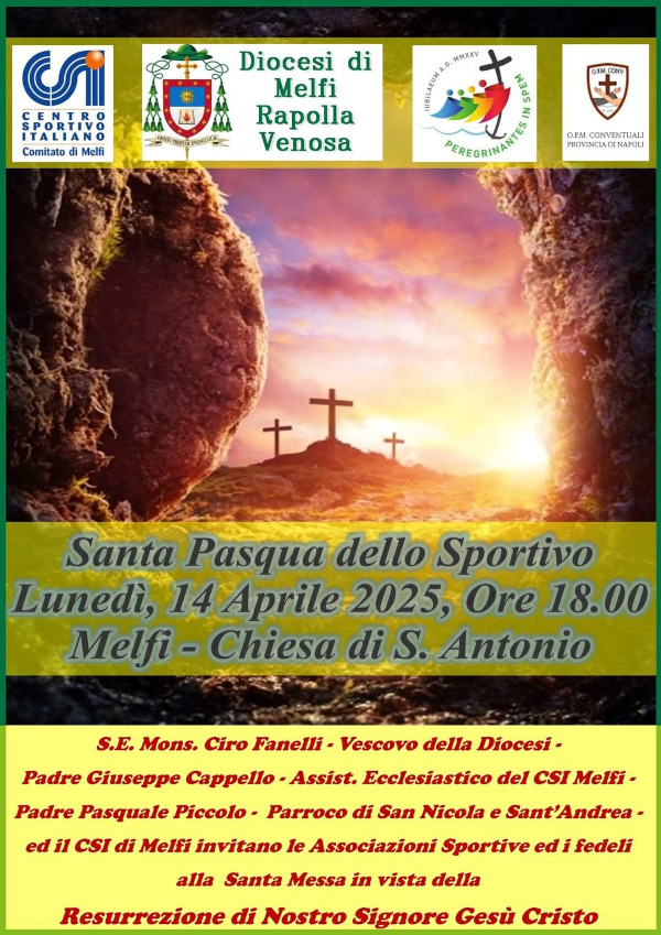 Lunedì 14 aprile a Melfi alle ore 18.00, presso la Chiesa di Sant’Antonio, sono invitate tutte le associazioni sportive ed i fedeli a partecipare alla Santa Messa di Pasqua dello Sportivo.