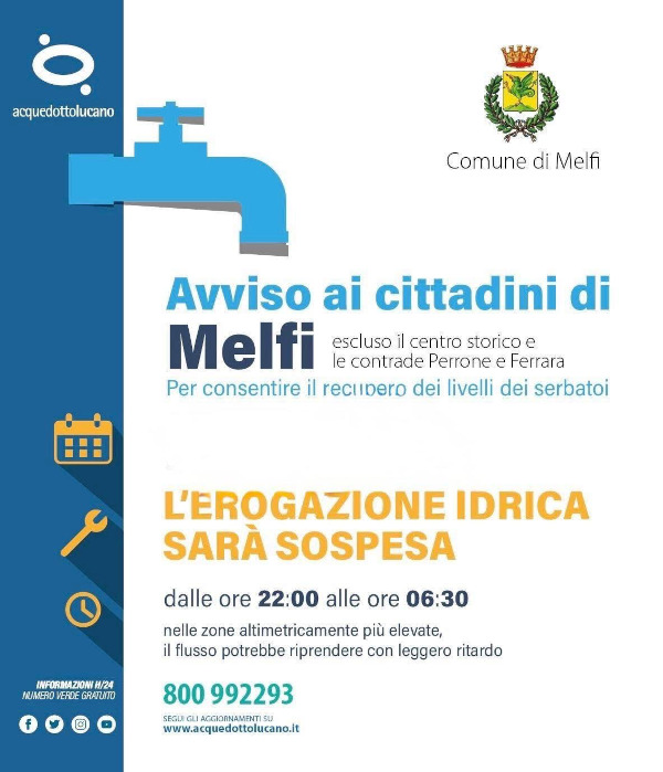 Come da calendario, sospensione idrica prevista a Melfi dalle 22:00 di stasera, giovedì 20 novembre. e fino alle 06:00 di domattina.