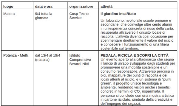 In Basilicata sono in programma 2 iniziative rivolte a cittadini, studenti e insegnanti, organizzate dai Paper Weeker – scuole, associazioni e realtà culturali – che hanno scelto di contribuire alla diffusione della cultura del riciclo di carta e cartone, avvicinando il pubblico alle buone pratiche di raccolta differenziata e al valore dei materiali cellulosici.
