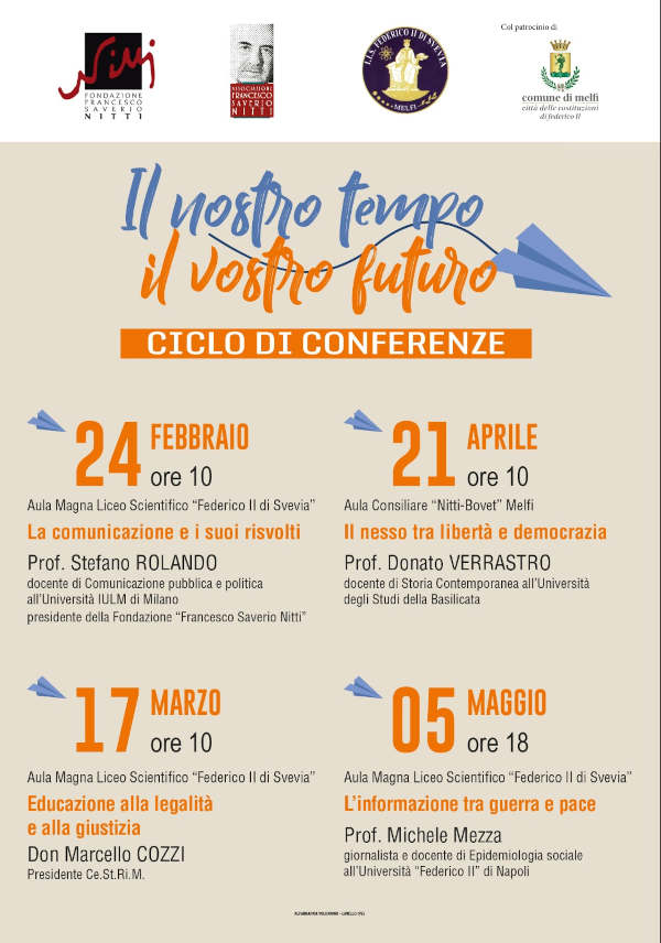 E’ il senso di “Il nostro tempo, il vostro futuro”, il ciclo di conferenze organizzato da Fondazione e Associazione “Francesco Saverio Nitti” unitamente all’I.I.S. “Federico II di Svevia“di Melfi che gode del patrocinio del comune di Melfi e che prenderà il via venerdì 24 febbraio, alle ore 10:00, presso l’Aula Magna del Liceo Scientifico della cittadina federiciana.