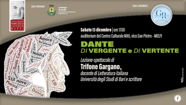 Sabato 13 Dicembre, alle ore 17.00 presso l’auditorium del centro culturale Nitti di Melfi (vico San Pietro snc), è in programma la lezione-spettacolo “Dante di-vergente e di-vertente” organizzata dall’Associazione “Francesco Saverio Nitti” con il patrocinio del comune di Melfi e il contributo dell’I.I.S. “Gasparrini-Righetti”.