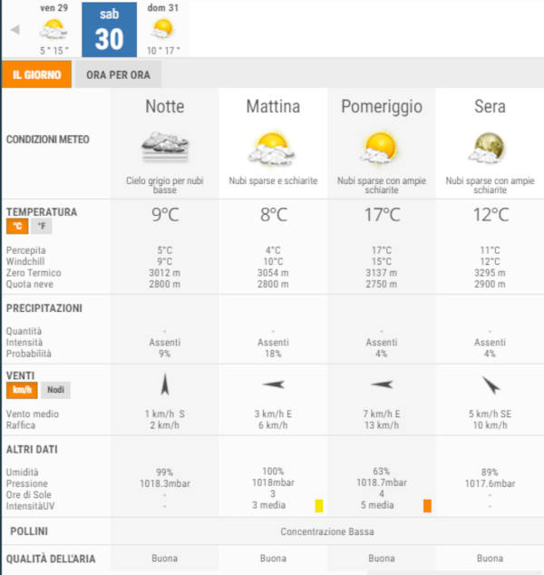 Secondo gli esperti di 3bmeteo, domani, Sabato 30 Ottobre, avremo nubi sparse e schiarite per l’intera giornata. Non sono previste piogge.