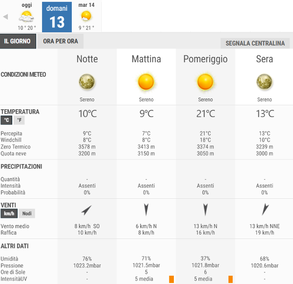 Invece, Martedì 14 Ottobre avremo cieli in prevalenza sereni o poco nuvolosi per l’intera giornata, non sono previste piogge.