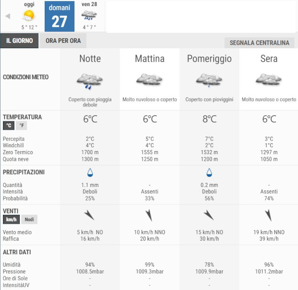 Secondo gli esperti di 3bmeteo domani, Giovedì 27 Novembre avremo cieli molto nuvolosi o coperti per tutto l’arco della giornata, con qualche piovasco pomeridiano.
