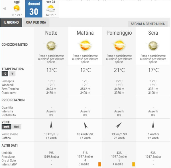 Secondo gli esperti di 3bmeteo domani, Giovedì 30 Ottobre avremo cieli in prevalenza parzialmente nuvolosi per l’intera giornata, non sono previste piogge.